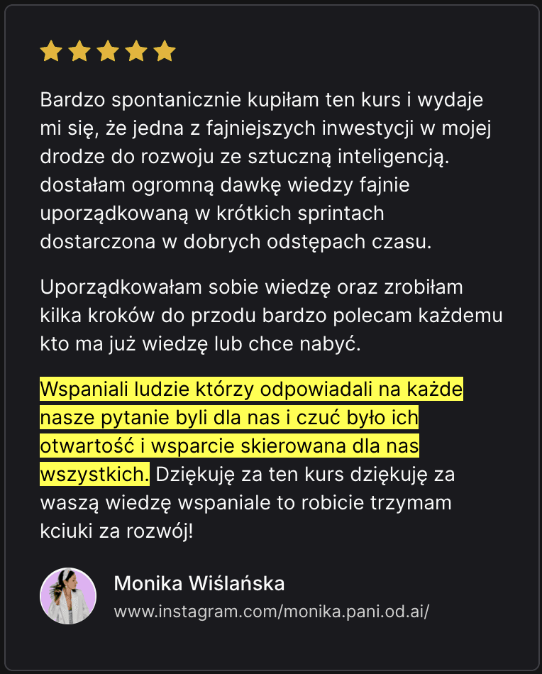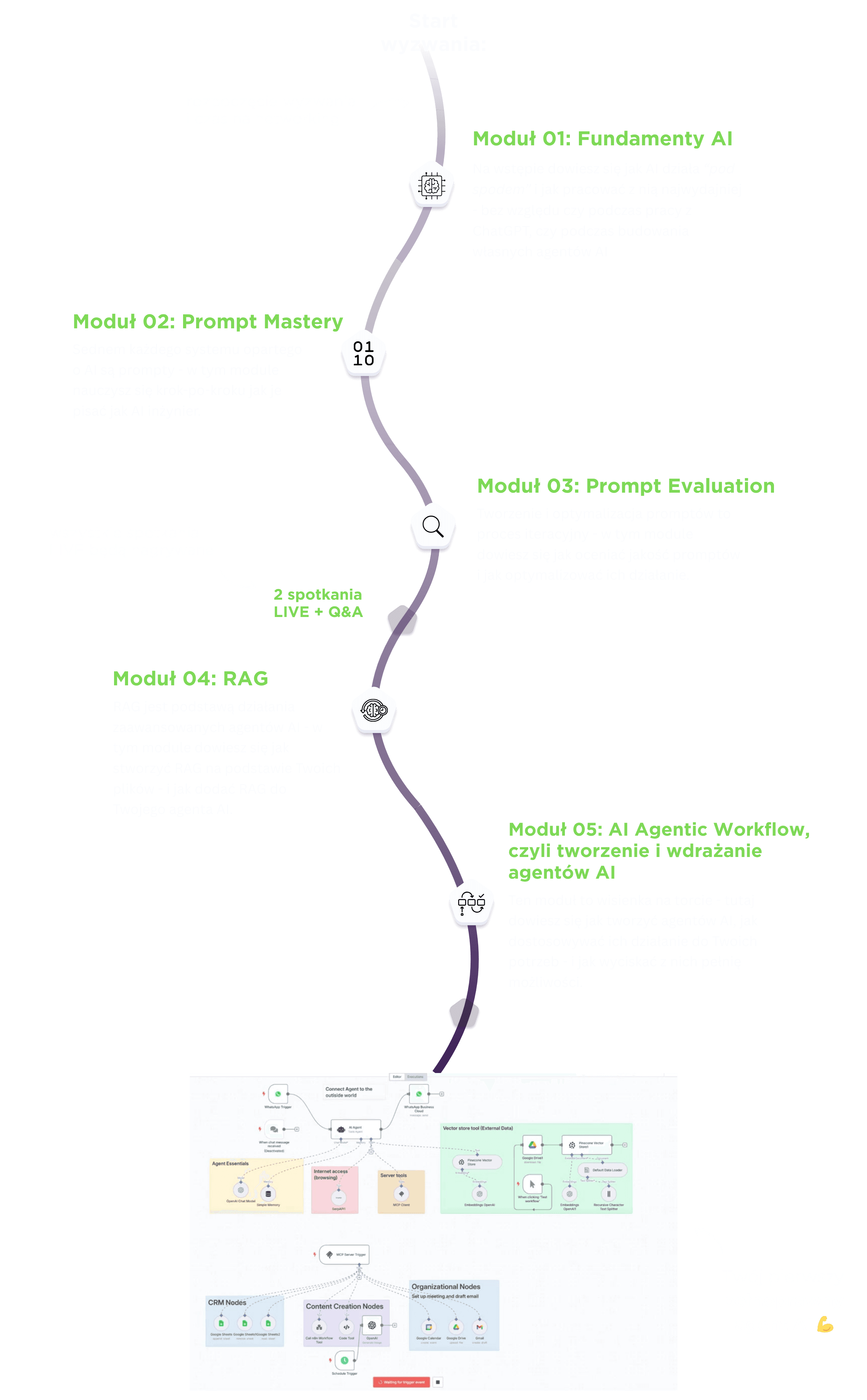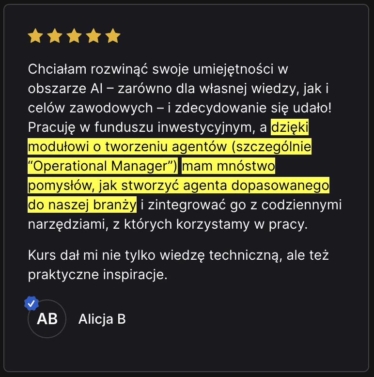 W środku będziesz miał_a okazję uczyć się bezpośrednio od Oli - AI engineera z ponad 7-letnim doświadczeniem - i dowiesz się krok-po-kroku wszystkiego, co musisz wiedzieć, żeby zbudować (i z sukcesem wdrożyć!) swoich pierwszych pełnoprawnych agentów AI…